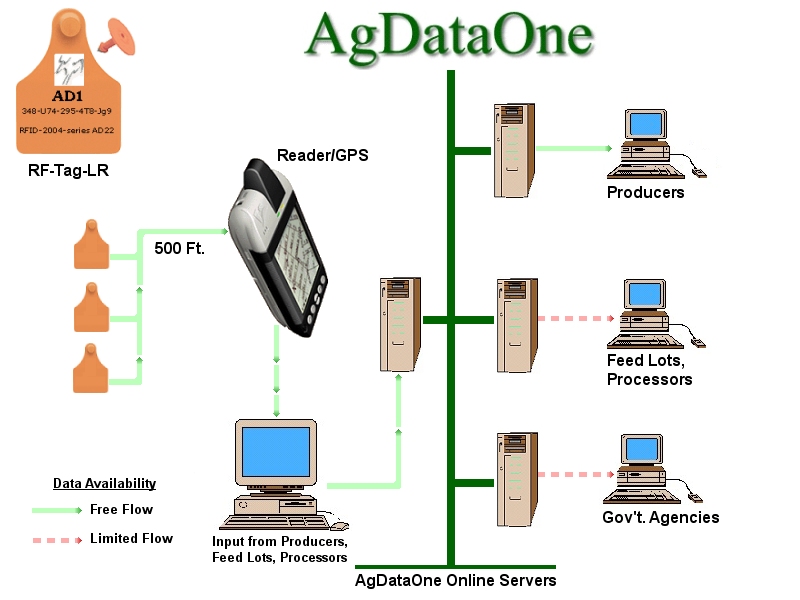 AgDataOne's LiveTrack™ incorporates active RFID technology and web based applications/interfaces built on open systems to fulfill the requirements of the USDA/USAIP animal identification plan.This system provides individual animal data-collection and reporting tools and is capable of tracking the nation's cattle and swine supply, which is fundamental to controlling any disease threat, foreign or domestic. By providing real-time source details, production details, immunization records, and custody information, the occurrence of and therein the rapid containment of animal health emergencies (such as foot-and-mouth disease or BSE) is realized. The AD1 ear tag/ transmitter is a high-performance synthesized ASK/OOK 450>1000Mhz low power Transmitter. (1mW of output power) This unit is capable of sending serial data at up to 10,000 bits/second. Due to the transmitter being completely self-contained, requiring an antenna as the only additional RF component, the sizing becomes appropriate for medium/large animal usage. This unit is programmed with a unique ID number during Fab, which will become the animal tracking ID. The AD1 receiver utilizes an advanced single-conversion superheterodyne